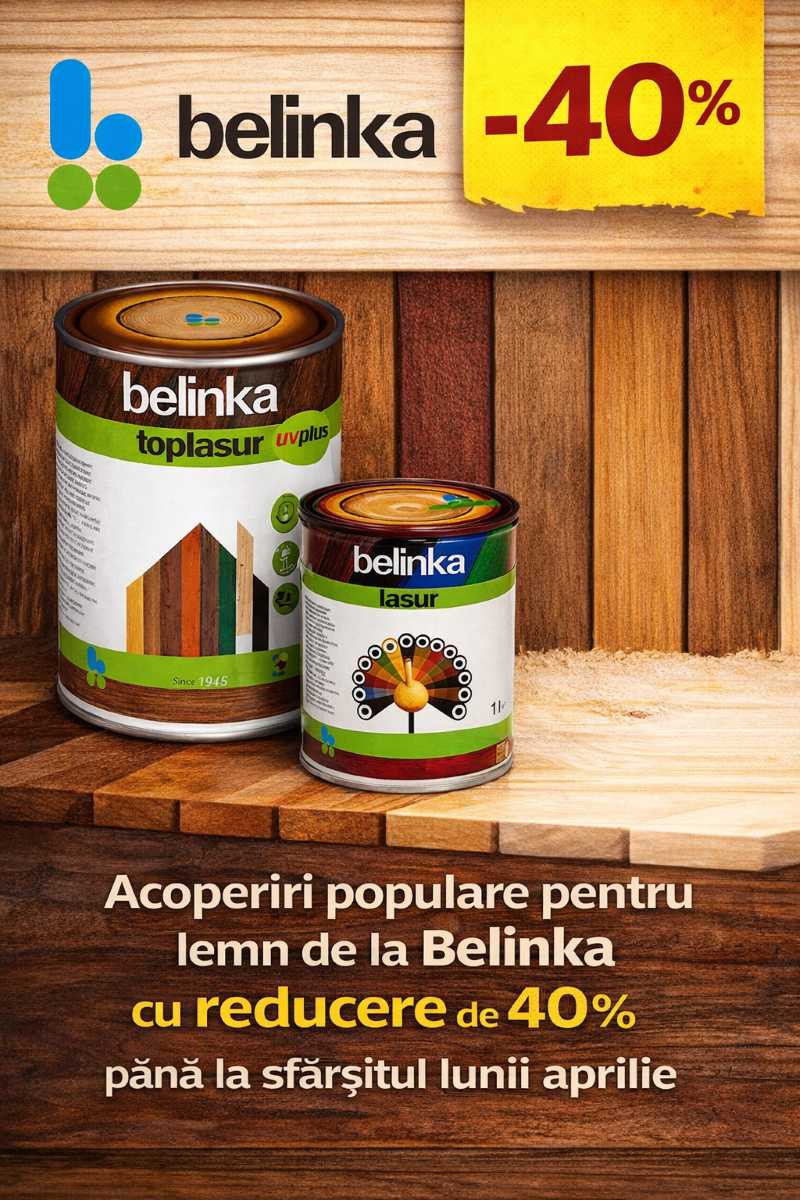 Până la finalul lunii aprilie 2026 ai reducere de 40% la poziții selectate Belinka Lazur și TopLasur — culori și volume populare, folosite frecvent pentru fațade, garduri și construcții din lemn.