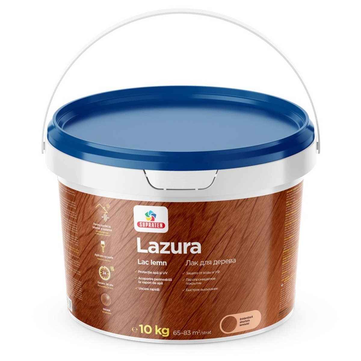 Lazura — готовый к использованию акриловый лак для защиты и декора древесины внутри и снаружи. Подходит для балюстрад, вагонки, дверей и окон, заборов, садовой мебели, домиков и других деревянных конструкций. Подчёркивает естественный рисунок древесины.