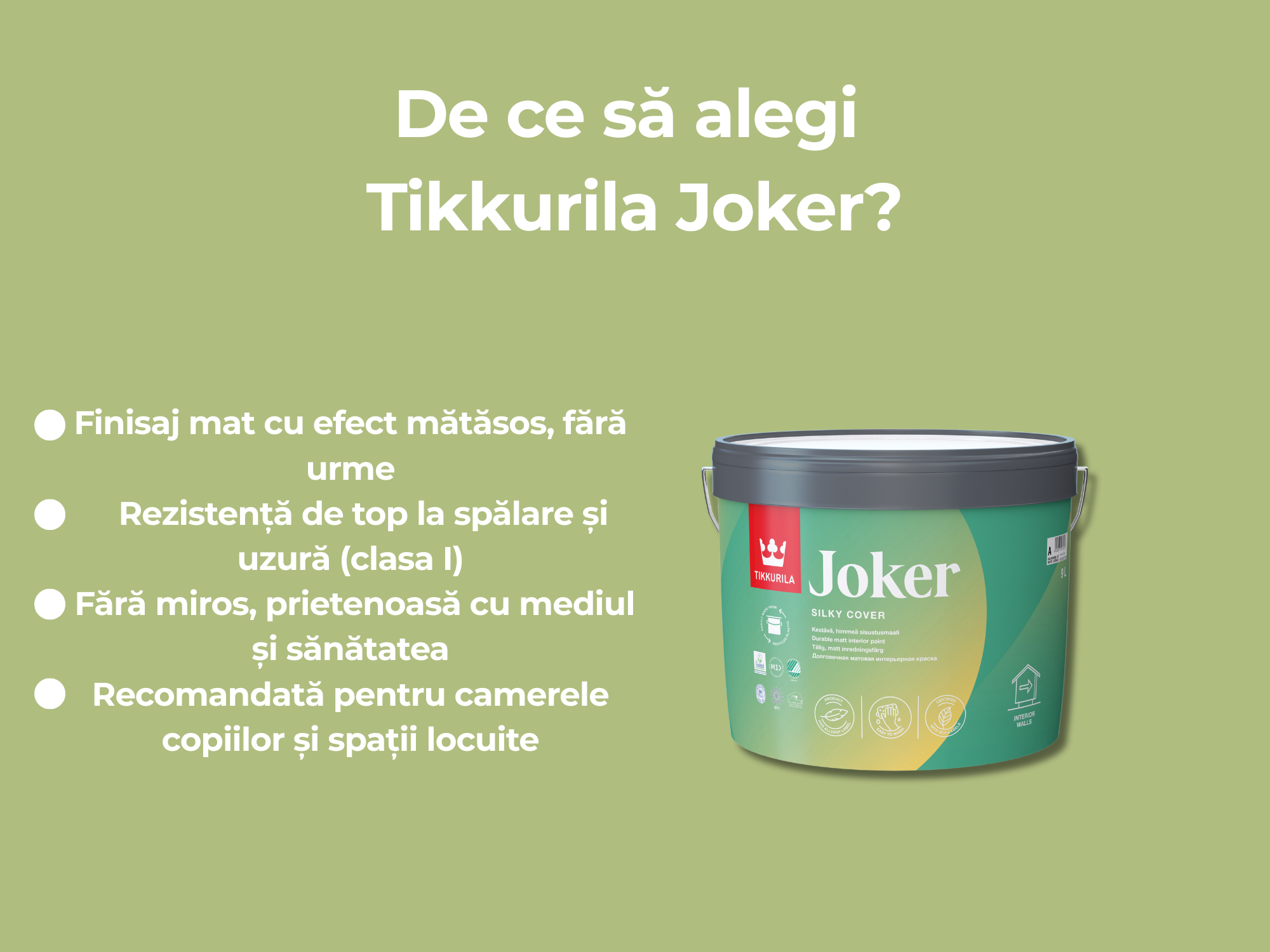 În orice pachet de cărți există un joker – imprevizibil, versatil, de nădejde. La fel e și vopseaua Tikkurila Joker: merge în orice cameră, e ușor de aplicat, sigură pentru toată familia și lasă în urmă un finisaj mat, calm și curat. Când nu știi exact ce să alegi, Joker e soluția care nu dă greș.